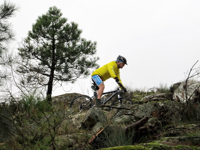 Junto ao marco entrámos num comprido single track pelo pinhal abaixo. Fantástica alternativa à descida do corta-fogo. A obra é do amigo Filipe que por vezes nas horas vagas, troca a bicicleta pela enxada.